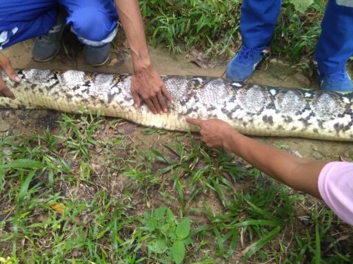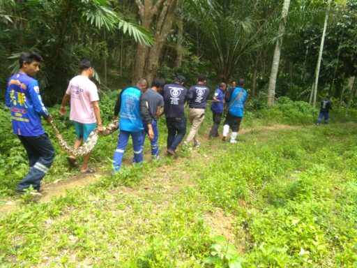 สุดท้ายผ่านไป 20 นาที จึงจับงูเหลือมได้สำเร็จ วัดความยาวได้ 6 เมตร หนักประมาณ 90 กิโลกรัม ก่อนที่เจ้าหน้าที่จำนวน 7 – 8 คน ช่วยอุ้มงูเหลือมเพื่อเคลื่อนย้ายไปใสกระสอบนำไปปล่อยป่าต่อไป จากการสอบถามชาวบ้านผู้แจ้ง เล่าว่า ขณะขับรถจักรยานยนต์ผ่านสวนยางพาราที่เกิดเหตุ พบว่ามีงูเหลือมขนาดใหญ่ บริเวณท้องป่อง กำลังเลื้อยผ่านหน้าเข้าพงหญ้าข้างทาง ยอมรับว่าตอนนั้นตกใจมาก เพราะไม่เคยเห็นงูเหลือมขนาดใหญ่แบบนี้ หลังตั้งสติได้ จึงแจ้งเจ้าหน้าที่ช่วยเหลือ