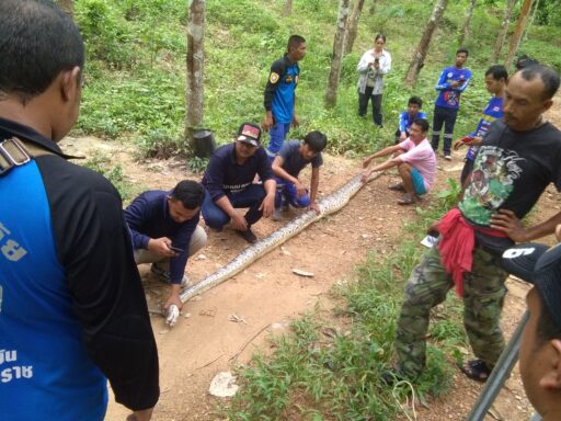 เมื่อเวลา 14.30 น.วันที่ 6 ต.ค.63 เจ้าหน้าที่อาสาสมัครมูลนิธิประร่วมใจบางขัน อ.บางขัน จ.นครศรีธรรมราช ได้รับแจ้งขอความช่วยเหลือชาวบ้านหมู่ 11 ต.บ้านนิคม อ.บางขัน ว่าพบงูเหลือมขนาดใหญ่นอนแน่นิ่งอยู่ข้างบ้าน จึงพร้อมหน่วยกู้ภัยบางขัน พร้อมกับอุปกรณ์จับงู รีบเดินทางไปตรวจสอบ เมื่อถึงที่เกิดเหตุในสวนยางข้างบ้าน พบงูเหลือมขนาดใหญ่กำลังเลื้อยอย่างเชื่องช้า เข้าในพงหญ้า เนื่องจากงูเหลือมเพิ่งกินเหยื่อ คาดว่าเป็นลูกหมูดินไปจนอิ่มท้องป่อง เจ้าหน้าที่จึงกระจายกำลังล้อม พร้อมใช่บ่วงอุปกรณ์จับงู พยายามคล้องที่หัว แต่ค่อนข้างลำบาก เนื่องจากงูเหลือมค่อนข้างดุ ไม่ยอมให้จับโดยดี