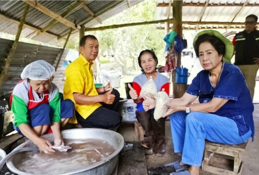 จากนั้น นางประนอม ทิวะพันธุ์ พร้อมคณะ ได้ไปสำรวจข้อมูลที่กลุ่มวิสาหกิจชุมชนแปรรูปเกลือบ่อโพธิ์ หมู่ที่ 1 บ้านบ่อโพธิ์ ต.บ่อโพธิ์ โดยมี นางคำเขียน พิมเสนา ประธานกลุ่มฯ ได้บรรยายให้ทราบถึงการนำเกลือสินเธาว์จากบ่อเกลือ 1,000 ปี มาเป็นส่วนผสมในการทำปลาส้ม ซึ่งมีส่วนผสมดังนี้ ข้าวเหนียว กระเทียม ปลาจีน ก่อนจะเดินทางไปสำรวจข้อมูลสถานที่สุดท้ายที่บ้านของ นายขยัน แพทย์ไชโย ผู้ใหญ่หมู่ที่ 1 บ้านบ่อโพธิ์ ที่ประกอบอาชีพทำไร่นาสวนผสม โดยมีการเพาะปลูกทุเรียน เงาะ อาโวคาโด้ และข้าวเหนียว บนเนื้อที่ 15 ไร่ ทั้งนี้การลงพื้นที่สำรวจและเยี่ยมเยือนประชาชนครั้งนี้ เพื่อเป็นการประชาสัมพันธ์และเผยแพร่หลักการพึ่งพาตนเองของชุมชนตามหลักปรัชญาเศรษฐกิจพอเพียง ตลอดจนส่งเสริมความรู้ด้านภูมิปัญญาท้องถิ่นของชุมชนให้เป็นที่รู้จักแพร่หลายมากยิ่งขึ้น