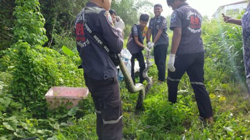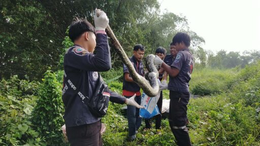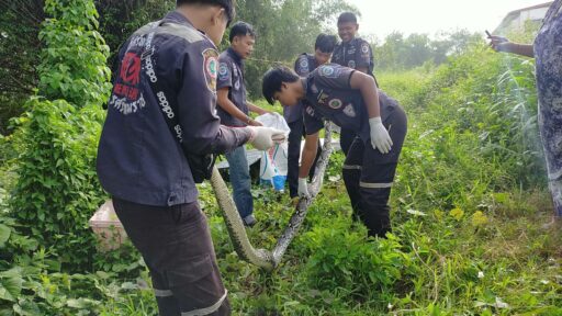 วันที่ 11 ต.ค. 2563 นางสาวสุวารีย์ คงแก้ว อายุ 53 ปี บ้านเลขที่ 206 ถนนหลักช้าง หมู่ 2 ต.ท่ายาง อ.ทุ่งใหญ่ จ.นครศรีธรรมราช แจ้งขอความช่วยเหลือจากหน่วยกู้ภัยศรัทธาสามัคคีการกุศล ให้มาช่วยจับงูเหลือที่มาติดตาข่ายหลังบ้านตนด้วย ก่อนที่มันจะขาดอากาศหายใจตาย จึงไปตรวจสอบที่เกิดเหตุบริเวณเล้าไก่หลังบ้านท่านประธานสภา พบงูเหลือมยาว 5 เมตร หนัก 30 กก.ติดตาข่ายที่กั้นเอาไว้ที่ชายคลองหลังบ้าน อยู่ในสภาพคอติดตาข่ายแน่น นอนหายใจรวยริน จึงช่วยตัดตาข่ายนำออกมาจับใส่กระสอบปุ๋ย ในเบื้องต้นงูเหลือมนอนแน่นิ่งคล้ายสิ้นฤทธิ์เนื่องจากถูกตาข่ายรัดคอไว้นาน พอเจ้าหน้าที่แก้ออกมาได้กลับมีเรี่ยวแรงต่อสู้ดิ้นไปมาอยู่นานกว่าจะจับใส่ถุงนำไปปล่อยป่าที่ห่างไกลชุมชน