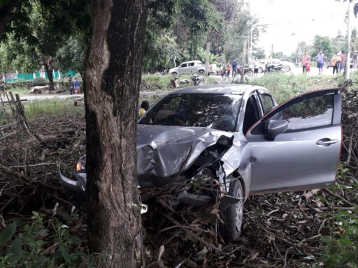 และพบรถยนต์เก๋งยี่ห้อมาสด้า สีบรอนซ์เทา ทะเบียน กต 1488 สุโขทัย ชนอัดก็อปปี้อยู่กับต้นไม้ห่างจากถนนประมาณ 15 เมตร สภาพหน้ารถพังยับเยินมีผู้บาดเจ็บจำนวน 3 ราย เจ้าหน้าที่กู้ภัยช่วยเหลือนำส่งให้แพทย์รักษาที่ รพ.พรหมพิราม ทราบชื่อคือ นายอนันต์ วัฒเพ็ชร อายุ 35 ปี บ้านเลขที่ 35 หมู่ 2 ต.ไกรใน อ.กงไกรลาส จ.สุโขทัย ด.ญ.นรัณญา วัฒเพ็ชร อายุ 10 ปี และ น.ส.สรัญญา พุกพัก อายุ 36 ปี บ้านเลขที่ 53/1 หมู่ 4 ต.ไกรกลาง อ.กงไกรลาส จ.สุโขทัย ตำรวจสอบสวนเบื้องต้นทราบว่า นายสมศักดิ์ ผู้เสียชีวิตกำลังขับรถ จยย.เพื่อกลับบ้านที่ ต.ดงประคำ แต่ถูกรถยนต์เก๋งชนจนทำให้เสียชีวิตดังกล่าว ส่วนสาเหตุการเกิดอุบัติเหตุที่แท้จริงครั้งนี้ ตำรวจจะได้ทำการสอบสวนอีกครั้งหนึ่งเพื่อดำเนินการตามกฎหมายต่อไป เบื้องต้นให้เจ้าหน้าที่กู้ภัยนำศพส่งให้แพทย์ชันสูตรอีกครั้งที่ รพ.พรหมพิราม ก่อนมอบศพให้ญาตินำไปบำเพ็ญกุศลตามประเพณี