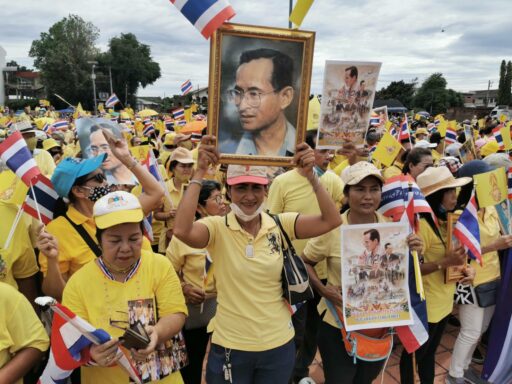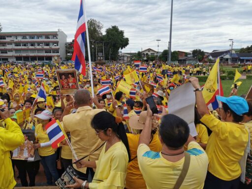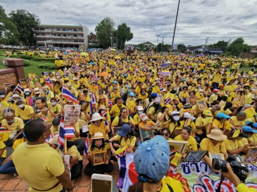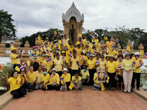 ชาวบ้าน จ.นครศรีธรรมราช นัดกันทางโซเชียลสวมเสื้อเหลืองเดินขบวนถือป้ายแสดงเจตจำนงปกป้องสถาบันหลักไปตามถนนราชดำเนิน