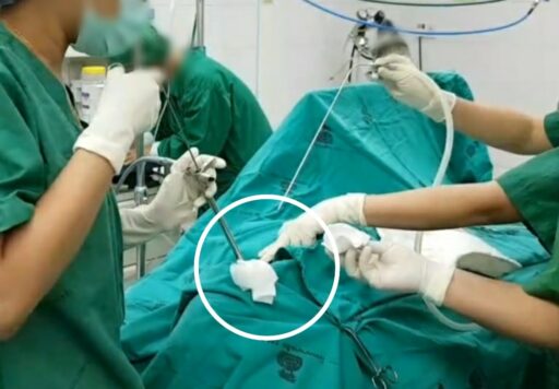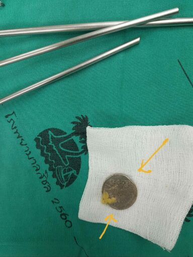 แพทย์จึงส่งต่อไปที่โรงพยาบาลสิชล แพทย์เวรส่งปรึกษาแพทย์ผู้เชี่ยวชาญด้าน หู คอ จมูก ให้เตรียมเข้าห้องผ่าตัดทันที งดน้ำ อาหาร ให้สารน้ำทางเส้นเลือดดำ เข้าห้องผ่าตัดต้องใส่ท่อในทางเดินหายใจเพื่อดมยาสลบ และป้องกันการสำลักเศษอาหาร น้ำ สิ่งแปลกปลอม เข้าหลอดลม จะยิ่งอันตราย และแพทย์ใช้เครื่องมือส่องกล้องชนิดพิเศษในหลอดอาหาร เตรียมไว้หลายขนาดให้พอดีกับเด็ก เห็นเหรียญติดค้างในแนวขวาง กดทับหลอดอาหารจนเป็นแผลลึกแต่ยังไม่ทะลุ ใช้เครื่องมือคีบดึงออกมาได้อย่างปลอดภัย หลังออกจากห้องผ่าตัดให้น้ำเกลือต่ออีก 1 วัน ให้ยาระงับปวด ยาปฏิชีวนะ เมื่อเห็นว่าไม่มีภาวะแทรกซ้อน เริ่มให้จิบน้ำ กินอาหารเหลว อาหารอ่อนได้ ที่อันตรายคือ อุดหลอดลมจนหายใจไม่ออกเสียชีวิตได้ง่าย ๆ หรือทิ้งไว้นานจนกดทับหลอดอาหารเป็นแผลทะลุ หรือบางรายผ่านหลอดอาหารไปได้แต่ไปติดค้างในลำไส้เล็กทำให้ลำไส้อุดตันจนต้องผ่าตัดใหญ่ในที่สุดก็มี
