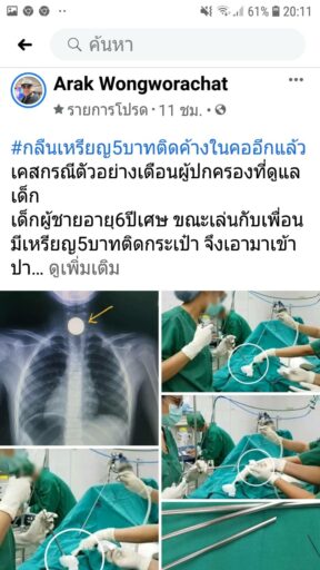 เมื่อ 4 พ.ย.2563 นพ.อารักษ์ วงศ์วรชาติ ผอ.รพ.สิชล จ.นครศรีธรรมราช ได้โพสต์ข้อความพร้อมภาพลงเฟสบุ๊คส่วนตัวชื่อ “Arak Wongwarachat” ข้อความว่า…#กลืนเหรียญ5บาทติดค้างในคออีกแล้ว เคสกรณีตัวอย่างเตือนผู้ปกครองที่ดูแลเด็ก เด็กผู้ชายอายุ 6 ปีเศษ ขณะเล่นกับเพื่อน มีเหรียญ 5 บาทติดกระเป๋า จึงเอามาเข้าปากอมไว้เล่น ๆ ช่วงที่เล่นเพลิน ๆ เผลอกลืนลงไป จนติดคอ ยิ่งพยายามกลืนยิ่งเจ็บ จนต้องทรุดตัวลงนั่งอาเจียน น้ำลายไหลฟูมปาก อึดอัดในคอมาก พูดไม่ค่อยออก กระทั่งผู้ปกครองมาพบจึงรีบพาส่งโรงพยาบาลใกล้บ้าน แพทย์ห้องฉุกเฉินเอกซเรย์ทรวงอก เห็นเหรียญติดอยู่ที่คอส่วนบน แต่อ้าปากใช้ไฟฉายส่องจะมองไม่เห็น เนื่องจากอยู่ลึกลงไปไม่สามารถเห็นได้ด้วยตาเปล่า
