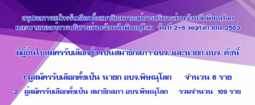 องค์การบริหารส่วนจังหวัดพิษณุโลก สรุปผลการสมัครรับเลือกตั้งสมาชิกและนายก อบจ.พิษณุโลก ที่เปิดรับสมัครระหว่างวันที่ 2 – 6 พฤศจิกายน 2563