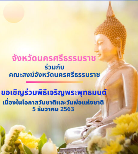 สำหรับการจัดพิธีเจริญพระพุทธมนต์เนื่องในวันชาติ และวันพ่อแห่งชาติ 5 ธันวาคม 2563 จังหวัดนครศรีธรรมราช ได้จัดครั้งที่ 1 เมื่อวันที่ 7 พ.ย.2563 ที่วัดศรีทวี ต.ท่าวัง อ.เมืองนครศรีธรรมราช ครั้งที่ 2 กำหนดจัดในวันเสาร์ที่ 14 พ.ย.2563 เวลา 10.00 น. ที่วัดพระพรหม ต.นาพรุ อ.พระพรหม ครั้งที่ 3 ในวันเสาร์ที่ 21 พ.ย.2563 เวลา 10.00 น. ที่วัดพรมหาธาตุ วรมหาวิหาร อ.เมืองนครศรีธรรมราช ครั้งที่ 4 ในวันเสาร์ที่ 28 พ.ย.2563 เวลา 10.00 น. ที่วัดบุญนารอบ อ.เมืองนครศรีธรรมราช จึงขอเชิญชวนพุทธศาสนิกชนเข้าร่วมพิธีโดยพร้อมเพรียงกัน การแต่งกายเสื้อสีขาว สอบถามรายละเอียดเพิ่ม สำนักงานพระพุทธศาสนาจังหวัดนครศรีธรรมราช โทร .0 7534 4714