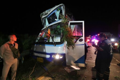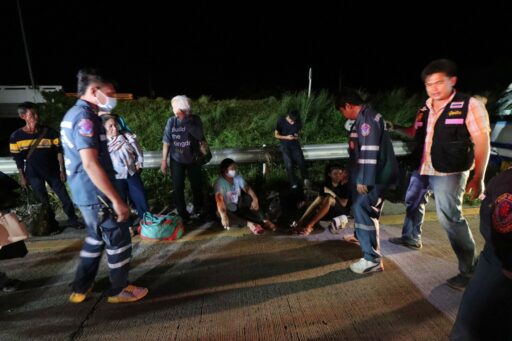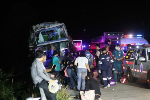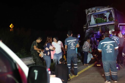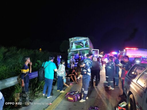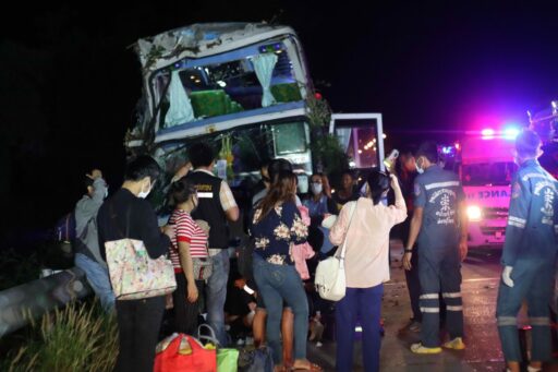รถทัวร์ชนยางอะไหล่ตกอยู่กลางถนนเสียหลักชนต้นไม้เจ็บ 10 ราย