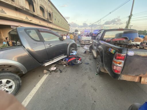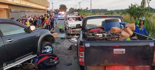 หนุ่มใหญ่รับเหมาก่อสร้าง ขับรถกระบะแซงรถตู้ไม่พ้นพุ่งชนประสานงากับรถกระบะที่สวนทางมาเสียชีวิตคาที่ ส่วนรถยนต์และจักรยานยนต์ตามพุ่งชนต่อ ทำให้ในที่เกิดเหตุมีผู้ได้รับบาดเจ็บ 3 ราย เสียชีวิต 1 ราย