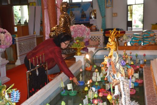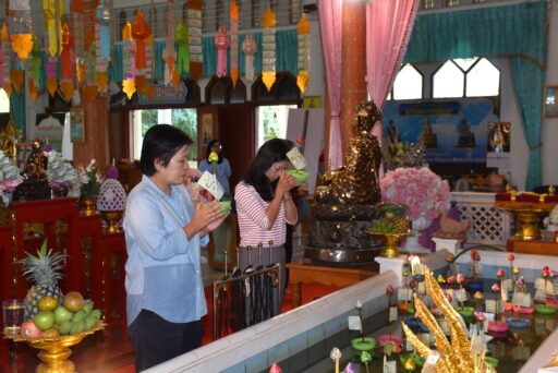 ด้าน นางขวัญใจ โตเฟื่อง อายุ 55 ปี ผู้ดูแลวิหารใหญ่พระอุปคุต เล่าให้ฟังว่า พระอุปคุตของวัดบึงกระดานถูกสร้างขึ้นเมื่อปี พ.ศ.2555 ประชาชนและนักท่องเที่ยวที่มากราบไหว้ขอพรจากพระอุปคุต จะจุดเทียนในแก้วที่ทางวัดเตรียมไว้ให้แทนธูป และถวายสร้อยประคำแทนดอกไม้ เพราะท่านเจ้าอาวาสเห็นว่าดอกไม้จะเหี่ยวเฉาไปตามกาลเวลา หากเราถวายดอกไม้โชคลาภของเราในอนาคตก็จะเหี่ยวเฉาตามไปด้วย จึงสมควรจัดเตรียมสร้อยประคำไว้ให้ประชาชนและนักท่องเที่ยวถวายสร้อยประคำแก่พระอุปคุต เนื่องจากพระอุปคุตจะสวมใส่สร้อยประคำ นอกจากนี้ทุกคนที่มาจะร่วมกันปิดทององค์พระอุปคุต และลอยกระทงในบ่อน้ำรอบองค์พระอุปคุตด้วย เป็นการลอยทุกข์โศกให้หมดไป คนที่มาขอพรจากพระอุปคุต ส่วนใหญ่จะขอให้เจริญก้าวหน้าในหน้าที่การงาน ให้เจริญรุ่งเรือง บางคนก็ขอให้มีงานทำ ขอโชคขอลาภ ขอให้ขายที่ดินขายพวกอสิงหาริมทรัพย์ได้ พอประสบความสำเร็จสมดั่งปรารถนาที่ขอไว้ จะนำบายศรี พวงมาลัย ไข่ต้มและผลไม้ รวมทั้งผ้าป่ามาถวายกัน