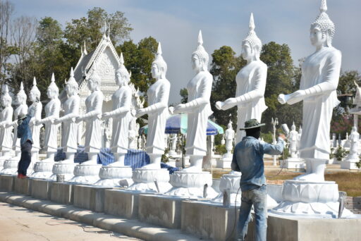 พระครูธีรพงศ์พิสุทธิ์ (เอกอุดม ธีรวํโส) เจ้าอาวาสวัดเสาหิน กล่าวต่อว่า เคยได้ไปกราบหลวงพ่อฤาษีลิงดำ แล้วก็ไปเห็นหลวงพ่อเงินไหลมาเทมาที่วัดท่าซุง จึงเกิดความศรัทธา แล้วบังเอิญรู้จักกับลูกศิษย์คนหนึ่งที่มีแบบจำลองหลวงพ่อเงินไหลมาเทมา จึงนำมาหล่อไว้ที่วัดเสาหิน เริ่มหล่อองค์แรกเมื่อวันที่ 4 พฤษภาคม 2562 โดยตั้งเป้าไว้ 108 องค์ แต่ละองค์ให้ประชาชนที่นับถือหลวงพ่อฤาษีลิงดำ หรือว่าเป็นคนที่ชอบสร้างพระพุทธรูปได้มาเป็นเจ้าภาพกัน ผลปรากฏว่า 108 องค์ ไม่พอต่อจำนวนผู้มีจิตศรัทธา จึงปรึกษากับพระลูกวัดว่าน่าจะสร้างสัก 500 องค์ เพื่อเป็นพุทธานุสติ เวลามีคนเข้ามาในวัดก็จะเห็นพระพุทธรูปนับร้อยองค์ยืนเรียงรายอุ้มบาตรรออยู่ เชื่อว่าใครทำอะไรไม่ดีมาหรือสิ่งไม่ดีอะไรที่ค้างคาใจให้เอามาใส่บาตรไว้ที่นี่ ในการก่อสร้างมีเจ้าภาพมาตลอด จนมาเจอช่วงโควิด-19 เมื่อปลายปี 2562 จึงหยุดสร้างไปประมาณ 4 เดือน กระทั่งสถานการณ์ดีขึ้นแล้ว จึงสร้างต่อโดยมีเจ้าภาพมาทำบุญหล่อหลวงพ่อเงินไหลมาเทมา ทุก ๆ วันเสาร์ จำนวน 3 องค์ ปัจจุบันหล่อเสร็จแล้ว 240 องค์ ด้วยมีแนวคิดที่อยากจะทำให้วัดเสาหินเป็น “พุทธอุทยาน” คืออุทยานที่เต็มไปด้วยพระพุทธรูปจำนวน 500 องค์ ปัจจุบันดำเนินการสร้างศาสนสถานและหลวงพ่อเงินไทลมาเทมา ได้ประมาณ 40 เปอร์เซ็นต์แล้ว