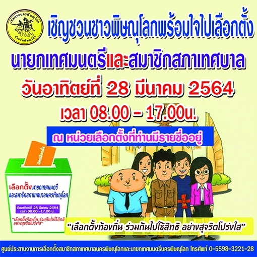 หากมีข้อสงสัยสามารถสอบถามรายละเอียดเพิ่มเติมได้ที่ สำนักปลัดเทศบาลนครพิษณุโลก โทร.055-983221-28 ต่อ 217 และที่สำนักทะเบียนท้องถิ่นเทศบาลนครพิษณุโลก โทร. 055-983221-28 ต่อ 113,114,115 เทศบาลนครพิษณุโลกขอเชิญชวนพี่น้องประชาชนชาวพิษณุโลกที่มีสิทธิเลือกตั้งออกมาใช้สิทธิเลือกตั้งสมาชิกาสภาเทศบาลและนายกเทศมนตรี ในวันอาทิตย์ที่ 28 มีนาคม 2564 ระหว่างเวลา 08.00-17.00 น. ณ หน่วยเลือกตั้งที่ท่านมีรายชื่ออยู่โดยพร้อมเพรียงกัน “เลือกตั้งท้องถิ่น ร่วมกันใช้สิทธิ อย่างสุจริตโปร่งใส”