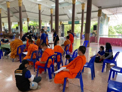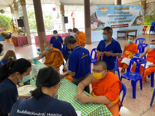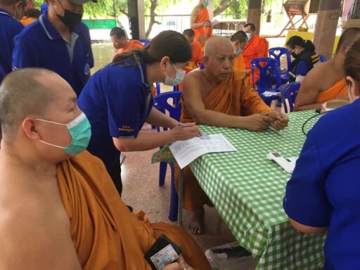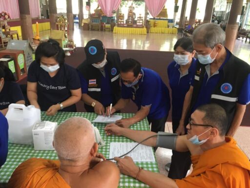 ชุมชนห่วงใยพระภิกษุและสามเณร ประสานเจ้าหน้าที่พยาบาลโรงพยาบาลของรัฐ ตรวจสุขภาพถึงที่พร้อมให้ความรู้ฝึกปฏิบัติการปฐมพยาบาลเบื้องต้น ส่วน อสม.และจิตอาสาของชุมชนร่วมกันกวาดใบไม้ใส่ทรายอะเบทกำจัดลูกน้ำยุงลาย