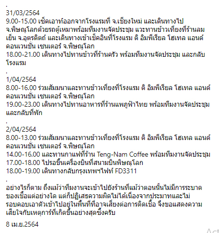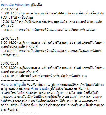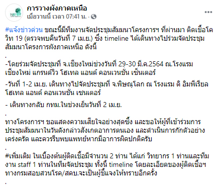 สำหรับ timeline ผู้ติดเชื้อโควิดได้เดินทางไปร่วมจัดประชุมสัมมนาโครงการผังภาคเหนือ ดังนี้ -โดยร่วมจัดประชุมที่ จ.เชียงใหม่ ช่วงวันที่ 29-30 มี.ค.2564 ที่โรงแรมเชียงใหม่ แกรนด์วิว โฮเทล แอนด์ คอนเวนชั่น เซ็นเตอร์ วันที่ 1-2 เม.ย. เดินทางไปจัดประชุมที่ จ.พิษณุโลก ที่โรงแรม ดิ อิมพีเรียล โฮเทล แอนด์ คอนเวนชั่น เซนเตอร์ เดินทางกลับ กทม.ในช่วงเย็นวันที่ 2 เม.ย. ทางโครงการฯ ขอแสดงความเสียใจอย่างสุดซึ้ง และขอให้ผู้ที่เข้าร่วมการประชุมสัมมนาในวันดังกล่าวสังเกตอาการตนเอง และดำเนินการกักตัวอย่างเคร่งครัด และควรรีบพบแพทย์หากมีอาการผิดปกติครับ”