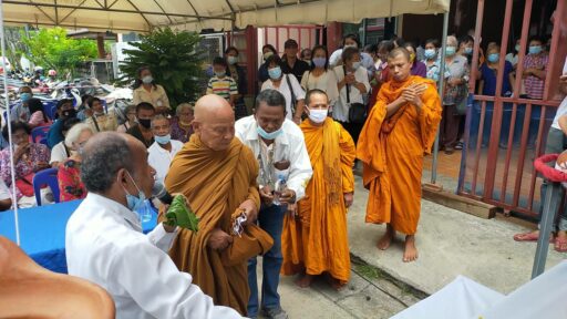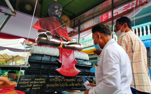 สำหรับหัวนะโม คือ ภาษาคำบูชาพระพุทธเจ้า คือ นะโม ตัสสะ ภะคะวะโต อะระหะโต สัมมาสัมพุท ธัสสะ ทั้งนี้เมื่อ 3 เดือนก่อนทางมูลนิธิได้มีการนิมนต์พระสงฆ์มาทำพิธีขจัดปัดเป่าโรคร้าย พร้อมสวดเสกน้ำมนต์เพื่อแจกจ่ายให้กับพี่น้องประชาชนไปแล้วรอบหนึ่ง มาครั้งนี้ถึงช่วงเทศกาลสงกรานต์ก็ได้ทำพิธีสวดเสกน้ำมนต์ขึ้นมาอีกครั้ง พร้อมทำพิธีขจัดปัดเป่าโควิดไปในตัว “สำหรับน้ำมนต์นี้สามารถรักษาโรคต่าง ๆ โรคทางจิตได้ หากผู้ใดถูกผีร้าย โรคร้าย สัตว์ร้าย วิญญาณร้ายเข้าทำร้ายตัว ก็สามารถนำน้ำมนต์นี้ไปขจัดปัดเป่า ดื่มกิน ติดบ้านไว้ วางหน้าบ้าน ตั้งบนหิ้งบูชา ก็สามารถทำได้” หลังเสร็จสิ้นพิธีพุทธศาสนิกชนที่เข้าร่วมต่างพากันนำขวดพลาสติกมาบรรจุน้ำมนต์ที่ผ่านการสวดเสกแล้วนำไปสรงน้ำพระพุทธสิหิงค์ ก่อนนำกลับไปบูชา ดื่มกิน และชำระร่างกาย ตามความเชื่อ และความตั้งใจที่มาร่วมในพิธีในครั้งนี้
