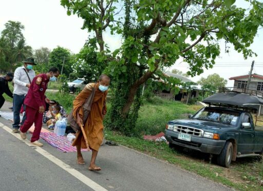 พุทธศาสนิกชนนั่งรอกราบนมัสการและถวายน้ำ หลวงตาบุญชื่น เจ้าหน้าที่กู้ภัย และ อสม. ประชาสัมพันธ์ให้มีการสวมแมสทุกคน และเว้นระยะห่าง ป้องกันโควิด – 19 อย่างเคร่งครัด คืนนี้หลวงตาจะจำวัดที่ วัดห้วยเหิน ต.ป่าแดง อ.ชาติตระการ