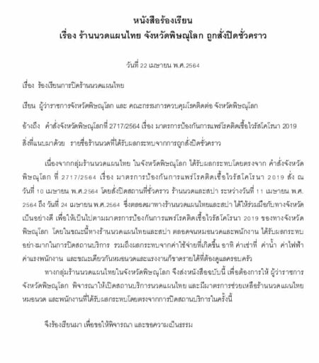 โดยระบุข้อความว่า “เนื่องจากกลุ่มร้านนวดแผนไทย ในจังหวัดพิษณุโลก ได้รับผลกระทบโดยตรงจาก คำสั่งจังหวัด พิษณุโลก ที่ 27 17/2564 เรื่อง มาตรการป้องกันการแพร่โรคติดเชื้อไวรัสโคโร นา 2019 สั่ง ณ วันที่ 10 เมษายน พ.ศ.2564 โดยสั่งปิดสถานที่ชั่วคราว ร้านนวดและสปา ระหว่างวันที่ 11 เมษายน พ.ศ.2564 ถึง วันที่ 24 เมษายน พ.ศ.2564 ซึ่งตลอดมาทางร้านนวดแผนไทยและสปา ได้ให้ร่วมมือกับทางจังหวัดเป็นอย่างดี เพื่อให้เป็นไปตามมาตรการป้องกันการแพร่โรคติดเชื้อไวรัสโคโรนา 2019 ของทางจังหวัดพิษณุโลก โดยในขณะนี้ทางร้านนวดแผนไทยและสปา ตลอดจนหมอนวดและพนักงาน ได้รับผลกระทบอย่างมากในการปิดสถานบริการ รวมถึงผลกระทบจากค่าใช้จ่ายที่เกิดขึ้น อาทิ ค่าเช่าที่ ค่าน้ำ ค่าไฟฟ้า ค่าแรงพนักงาน และขณะเดียวกันหมอนวดและแรงงานก็ขาดรายได้ที่ต้องดูแลครอบครัว ทางกลุ่มร้านนวดแผนไทยในจังหวัดพิษณุโลก จึงส่งหนังสือฉบับนี้ เพื่อต้องการให้ ผู้ว่าราชการจังหวัดพิษณุโลก พิจารณาให้เปิดสถานบริการนวดแผนไทย และมีมาตรการช่วยเหลือร้านนวดแผนไทยหมอนวด และพนักงานที่ได้รับผลกระทบโดยตรงจากการปิดสถานบริการในครั้งนี้ จึงร้องเรียนมา เพื่อขอให้พิจารณา และขอความเป็นธรรม”