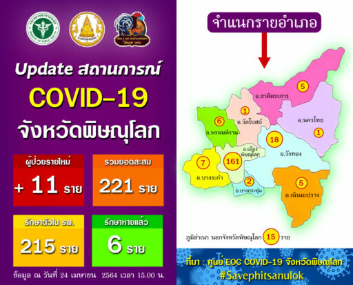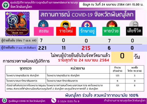 จึงขอความร่วมมือพี่น้องชาวพิษณุโลกทุกท่านร่วมด้วยช่วยกันในการลดการเกิดการติดเชื้อด้วยการอยู่บ้าน ล้างมือ ใส่หน้ากาก ใช้ซ้อนฉัน อยู่ห่างกัน 2 เมตรและ สแกนไทยชนะ “เราจะผ่านพ้นวิกฤต covid-19 ไปด้วยกัน” ส่วนสถานการณ์ผู้ป่วย Covid-19 จังหวัดพิษณุโลก ประจำวันที่ 24 เม.ย.2564 มียอดผู้ป่วยรายใหม่เพิ่มขึ้น 11 ราย ยอดสะสมเดิม 210 ราย รวมยอดผู้ป่วยสะสมเป็น 221 ราย ซึ่งผู้ป่วยรายใหม่ 11 ราย จำแนกเป็น อ.เนินมะปราง 1 ราย, อ.พรหมพิราม 2 ราย, อ.เมืองพิษณุโลก 6 ราย และจังหวัดสุโขทัย 2 ราย