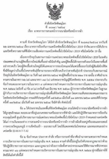 เมื่อเวลา 15.00 น. วันที่ 25 เม.ย.2564 นายรณชัย จิตรวิเศษ ผวจ.พิษณุโลก ได้ลงนามในหนังสือด่วนที่สุดที่ พล 0017.2/ ง 2963 ลงวันที่ 25 เม.ย.2564 เรื่อง คำสั่งมาตรการป้องกันการแพร่โรคติดเชื้อไวรัสโคโรนา 2019 (โควิด-19) เรื่องมาตรการการสวมหน้ากากอนามัยหรือหน้ากากผ้า ถึงหัวหน้าส่วนราชการที่เกี่ยวข้องและ อปท.ทุกแห่ง โดยมีใจความสำคัญดังนี้ เพื่อเป็นการลดความเสี่ยงในการได้รับเชื้อตลอดเวลาที่อยู่นอกเคหสถานหรือออกจากที่พำนัก มติคณะกรรมการโรคติดต่อจังหวัดพิษณุโลก ให้ประชาชนในเขตพื้นที่ จ.พิษณุโลก สวมใส่หน้ากากอนามัยหรือหน้ากากผ้าให้ถูกสุขลักษณะ ตลอดเวลาที่อยู่นอกเคหสถานหรือออกจากที่พำนัก หากผู้ใดฝ่าฝืนไม่ปฏิบัติตาม มีความผิดตามมาตรา 51 พระราชบัญญัติโรคติดต่อ พ.ศ.2558 ต้องระวางโทษปรับไม่เกินสองหมื่นบาท และมีความผิดตามมาตรา 18 แห่งพระราชกำหนดการบริหารราชการในสถานการณ๕ฉุกเฉิน พ.ศ.2545 ต้องระวางโทษจำคุกไม่เกิน 2 ปี ปรับไม่เกินสี่หมื่นบาท หรือทั้งจำทั้งปรับ จึงขอให้ทุกภาคส่วนทั้งภาครัฐ และ อปท.ประชาสัมพันธ์ให้ประชาชนในพื้นที่รับทราบและถือปฏิบัติอย่างเคร่งครัด ทั้งนี้ตั้งแต่วันที่ 25 เม.ย.2564 เป็นต้นไปจนกว่าจะมีคำสั่งเปลี่ยนแปลงเป็นอย่างอื่น