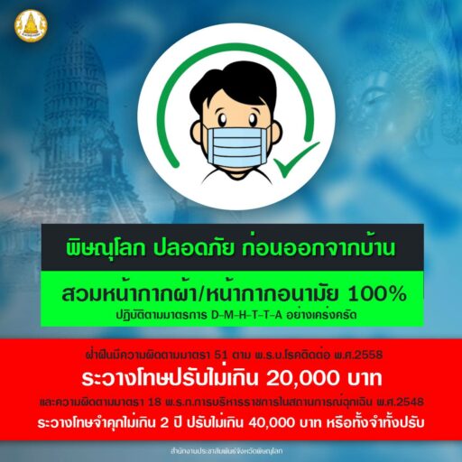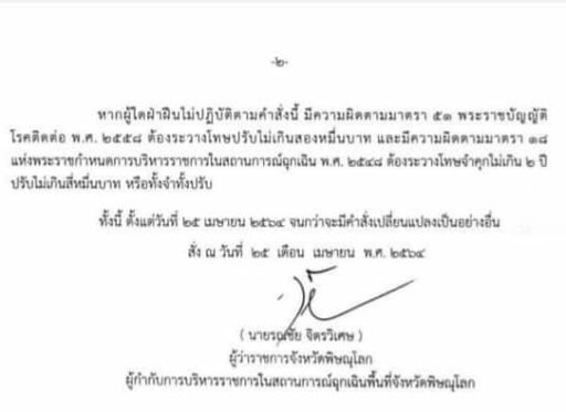 ผู้ว่าราชการจังหวัดพิษณุโลก ออกคำสั่งให้ ประชาชนทุกคน ต้องสวมใส่หน้ากากอนามัย หรือ หน้ากากผ้า 100 เปอร์เซ็นต์ เมื่อต้องออกจากบ้าน หากฝ่าฝืนมีโทษจำคุก 2 ปี ปรับ 20,000 – 40,000 บาท หรือทั้งจำและปรับ เริ่มตั้งแต่วันนี้เป็นต้นไป