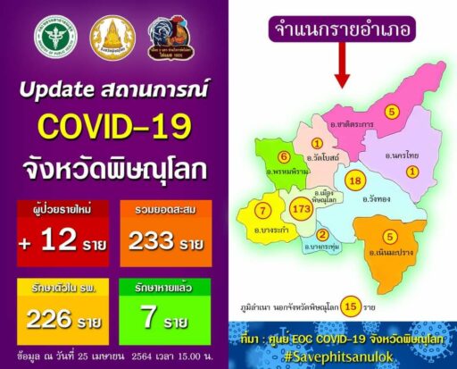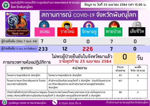 สำหรับสถานการณ์ผู้ป่วย Covid-19 จังหวัดพิษณุโลก ประจำวันที่ 25 เมษายน 2564 เวลา 15.00 น. มีผู้ป่วยรายใหม่ 12 ราย ยอดสะสมเดิม 221 ราย รวมเป็น 233 ราย โดยผู้ป่วยรายใหม่อยู่ใน อ.เมืองพิษณุโลก ทั้งหมด ปัจจุบันรักษาหายแล้ว 7 ราย คงเหลือผู้ป่วยที่รักษาตัวอยู่ในโรงพยาบาล 266 ราย