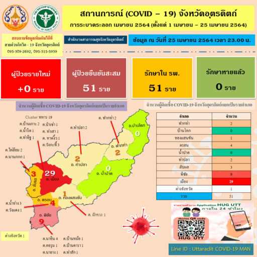 เมื่อวันที่ 26 เมษายน 64 เวลา 10.00 น. นายผล ดำธรรม ผวจ.อุตรดิตถ์ ในฐานะประธานคณะกรรมการโรคติดต่อจังหวัดอุตรดิตถ์ เปิดเผยว่า ตามที่ได้มีประกาศคณะกรรมการโรคติดต่อจังหวัดอุตรดิตถ์ เรื่อง มาตรการเฝ้าระวังและควบคุมการแพร่ระบาดของโรคติดเชื้อไวรัสโคโรนา 2019 (COVID – 19) ฉบับที่ 10 ลงวันที่ 10 เมษายน 2564 โดยปัจจุบันสถานการณ์การแพร่ระบาดของโรคฯ ยังพบผู้ติดเชื้อรายใหม่เพิ่มขึ้น ประกอบกับข้อมูลจากกระทรวงสาธารณสุขพบว่า การแพร่ระบาดของโรคดังกล่าวเป็นสายพันธุ์ที่สามารถติดต่อและแพร่กระจายได้อย่างรวดเร็ว ซึ่งในพื้นที่จังหวัดอุตรดิตถ์ที่มีการระบาดระลอกของโควิด ตั้งแต่วันที่ 1-23 เมษายน 64 มีผู้ติดโควิด-19 จำนวน 51 ราย เพื่อเป็นการป้องกันการแพร่ระบาดของโรคในพื้นที่ จึงเน้นย้ำให้ปฏิบัติตามมาตรการป้องกันโรคที่ทางราชกำหนดโดยเฉพาะมาตรการ DMHTT ได้แก่ D – Distancing : อยู่ห่างไว้ M – Mask wearing : ใส่หน้าผ้าหรือหน้ากากอนามัย H – Hand wash : หมั่นล้างมือ T – Testing : ตรวจวัดอุณหภูมิ T – Thai Cha na : ใช้แอปฯ ไทยชนะ