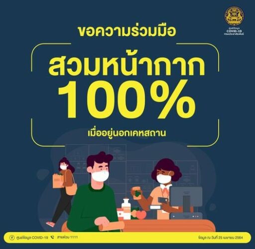 “ในกรณีประชาชนไม่สวมหน้ากากอนามัย/หน้ากากผ้า เมื่ออยู่นอกเคหสถาน/ สถานที่สาธารณะ หากผู้ใดฝ่าฝืนไม่ปฏิบัติตามมาตรการที่กำหนด กระทำการหรือดำเนินการใดๆ ซึ่งอาจก่อให้เกิดสภาวะที่ไม่ถูกสุขลักษณะซึ่งอาจเป็นเหตุให้โรคติดต่ออันตรายหรือโรคระบาดแพร่ออกไปย่อมมีความผิดตามมาตรา 18 แห่งพระราชกำหนดการบริหารราชการ ในสถานการณ์ฉุกเฉิน พ.ศ.2548 ซึ่งอาจต้องระวางโทษจำคุกไม่เกิน 2 ปีหรือปรับไม่เกิน 40,000 บาท บาท หรือทั้งจำทั้งปรับ และความผิดตามมาตรา 34 (6) แห่งพระราชบัญญัติโรคติดต่อ พ.ศ.2558 ต้องระวางโทษปรับไม่เกิน 20,000 บาท จึงขอความร่วมมือผู้ประกอบการและประชาชนให้ถือปฏิบัติตามมาตรการที่กำหนดอย่างเคร่งครัดต่อไป”