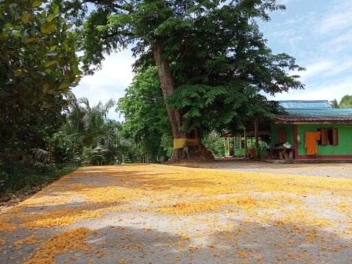 ทองคำเต็มลานวัด…แตกตื่นปรากฏการณ์มหัศจรรย์คล้ายลานวัดเขาพระทอง ปูด้วยทองคำเหลืองอร่าม หลังฝนตกลมพักกรรโชก ดอกประดู่ยักษ์ร่วงหล่นเต็มพื้นลานวัด ประชาชนและนักท่องเที่ยวตื่นตาตื่นใจก่อนกราบหลวงพ่อองค์ใหญ่และเช่าหัวนะโม แหวนหัวนะโมเชื่อแคล้วคลาดปลอดภัยจากภัยร้ายไวรัสโควิด-19