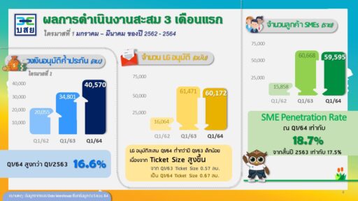 บรรษัทประกันสินเชื่ออุตสาหกรรมขนาดย่อม (บสย.) เผยผลดำเนินงานค้ำประกันสินเชื่อไตรมาสที่ 1 มกราคม – มีนาคม 2564 ยอดอนุมัติค้ำประกันสินเชื่อพุ่ง 40,570 ล้านบาท เพิ่มขึ้น 16.6 เปอร์เซ็นต์