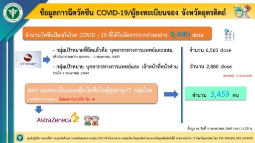 .สำหรับการลงทะเบียนเพื่อเข้ารับการฉีดวัคซีนของกลุ่มผู้ที่มีอายุ 60 ปีขึ้นไปและผู้ป่วย 7 กลุ่มโรค ของ จ.อุตรดิตถ์ ขณะนี้ (5 พ.ค.64 เวลา 11.00น.) มีผู้ลงทะเบียนแล้ว 3,459 คน ซึ่งมีแผนดำเนินการฉีดในเดือน มิ.ย.64 ตามที่ส่วนกลางได้กำหนด ซึ่งในปัจจุบัน จ.อุตรดิตถ์ ได้รับการจัดสรรวัคซีนของซิโนแวค จำนวน 9,440 โดส โดยฉีควัคซีนให้กับบุคลากรทางการแพทย์และ อสม.แล้ว จำนวน 6,560 โดส และเตรียมฉีดให้บุคลากรทางการแพทย์และเจ้าหน้าที่ด่านหน้าอีกจำนวน 2,880 โดส ในวันที่ 7 พ.ค.64 เพื่อลดความเสี่ยงในการติดเชื้อโควิด-19