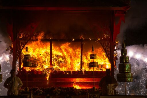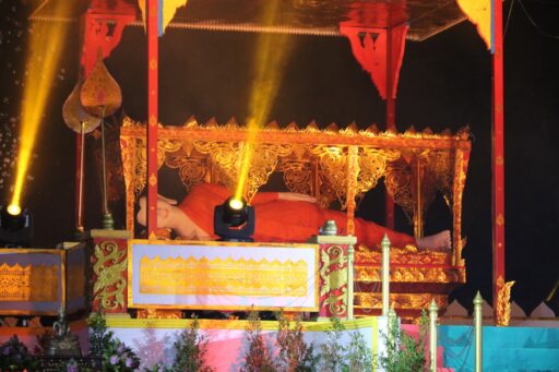 โดยจำลองเหตุการณ์ในครั้งนั้นตามขั้นตอนอย่างละเอียด ตั้งแต่เสด็จปรินิพพาน ซึ่งจะมีชาวบ้านที่มีฝีมือด้านงานจักสานมาช่วยกันใช้ไม้ไผ่สานองค์พระพุทธเจ้าปางปรินิพพานขนาดใหญ่ ตกแต่งอย่างสวยงามบรรจุไว้ในโลงแก้ว ตั้งประดิษฐานไว้บนศาลา เพื่อให้คณะสงฆ์สวดพะอภิธรรม และชาวบ้านทำบุญตักบาตร ปฏิบัติธรรม ซึ่งเป็นวันอัฐมีบูชาหรือวันถวายพระเพลิงพระพุทธสรีระพระพุทธเจ้า จำลองทุกขั้นตอนในพิธีถวายพระเพลิง พระบรมศพเสมือนครั้งพุทธกาล