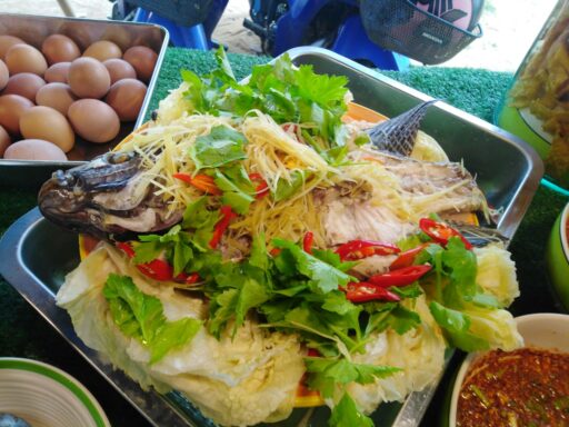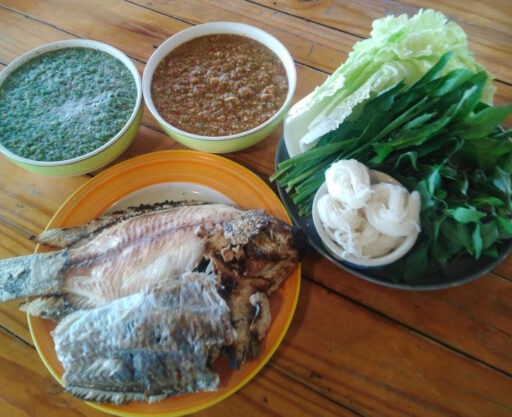 สำหรับขนมจีน จะมีน้ำยาปลาช่อนที่เข้มข้นไปด้วยเนื้อปลา และแกงเขียวหวานไก่ ซึ่งเป็นเมนูยืนพื้นมีทุกวัน และมีเมนูเมี่ยงปลาเผา ในราคาชุดละ 99 บาทไว้บริการด้วย โดย 1 ชุด จะมีปลานิลไซส์ 8 ขีด เผา 1 ตัว ผัก น้ำจิ้มซีฟู้ด น้ำจิ้มเมี่ยงปลา และขนมจีน ซึ่งนับว่าเป็นราคาที่คุ้มมาก นอกจากนี้ยังมีขนมหวานเป็นประเภทน้ำแข็งไสยืนพื้น และขนมหวานผลัดเปลี่ยนหมุนเวียนกันมาให้ทานทุกวัน อาทิ กล้วยบวชชี บวชฟักทอง มันต้มขิง เป็นต้น ลูกค้าจะตักกี่รอบก็ได้ในราคาเหมาทั้งอาหาร-คาวหวาน เพียง 49 บาท แต่มีข้อแม้ว่าตักแล้วต้องทานให้หมด ถ้าไม่หมดจะปรับเป็นเงิน 94 บาท แต่ผ่านมา 5 เดือน ก็ไม่เคยได้ปรับใครเลย เพราะลูกค้ามีวินัยทานกันหมดทุกจาน