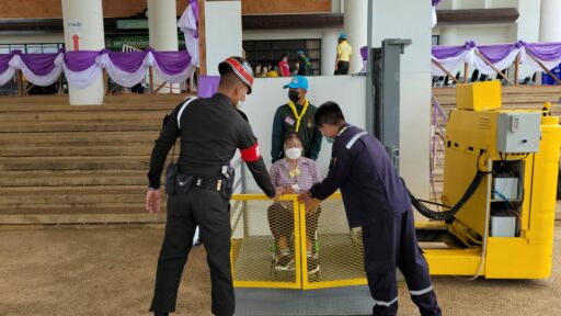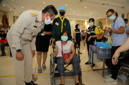 บรรยากาศในการฉีดวัคซีนวันแรกที่หอประชุมศรีวชิรโชติ เจ้าหน้าที่ได้จัดระบบการจราจร และการอำนวยความสะดวกให้ผู้รับบริการอย่างดี จัดให้มีการเดินรถวันเวย์ สำหรับผู้สูงอายุที่เดินไม่สะดวก หรือ นั่งรถเข็น ญาติสามารถขับรถขึ้นมาด้านหน้าหอประชุมได้ทันที มีเจ้าหน้าที่คอยอำนวยความสะดวกรถเข็น และลิฟท์สำหรับยกรถเข็นขึ้นไปด้านบน และจะพาไปยังจุด ONE STOP SARVICE มีจิตอาสาคอยอำนวยความสะดวกให้ ส่วนกลุ่มผู้สูงอายุที่เดินสะดวก และกลุ่มเสี่ยง จะจัดลำดับให้มาลงทะเบียนชั้นล่างหอประชุมก่อน และจะทยอยเรียกขึ้นไปลงทะเบียน วัดความดันด้านบนเพื่อรอการฉีดวัคซีนตามลำดับ
