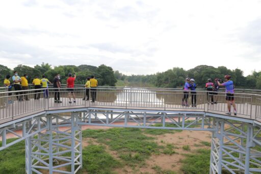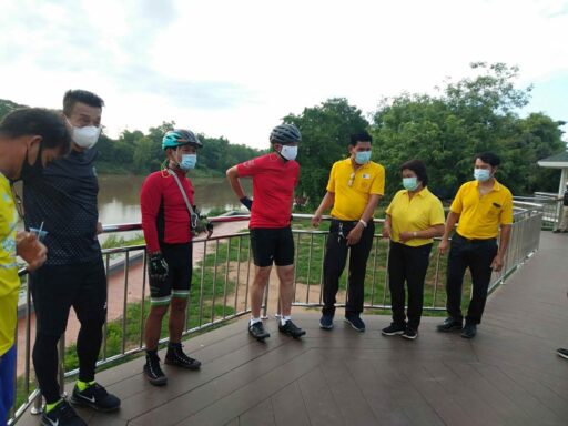 จากนั้น นายรณชัย ผวจ.พิษณุโลก พร้อมคณะได้เยี่ยมชมจุดท่องเที่ยว “สกายวอร์ค” ของ อบต.จอมทอง ซึ่งตั้งอยู่บริเวณจุดต้นกำเนิดของตำนานเมืองสองแควที่มีแม่น้ำ 2 สาย คือ แม่น้ำแควน้อยไหลมาบรรจบกับแม่น้ำน่านบริเวณนี้ นับว่าเป็นจุดที่มีบรรยากาศของแม่น้ำสองสีมาบรรจบกันและทิวทัศน์ที่สวยงามน่าไปเที่ยวชมอย่างยิ่ง ซึ่งบริเวณทางจังหวัดและทุกภาคส่วนที่เกี่ยวข้อง เตรียมส่งเสริมให้เป็นเป็นจุดเช็คอินหรือสถานที่ท่องเที่ยวแห่งใหม่ของจังหวัดพิษณุโลกด้วย จากนั้นได้พากันปั่นจักรยานต่อไปตามถนนเลียบแม่น้ำน่าน ข้ามสะพานจอมทองลัดเลาะชมวิวทิวทัศน์ที่สวยงามสองข้างทาง และเลี้ยวกลับขบวนรถบริเวณสำนักงานตำรวจภูธรภาค 6 ต.มะตูม อ.พรหมพิราม มุ่งหน้าเข้าสู่ตัวเมืองพิษณุโลก ผ่าน ต.มะขามสูง และ ต.ปากโทก ก่อนสิ้นสุดปลายทางที่จวน ผวจ.พิษณุโลก รวมระยะทางกว่า 30 กิโลเมตร
