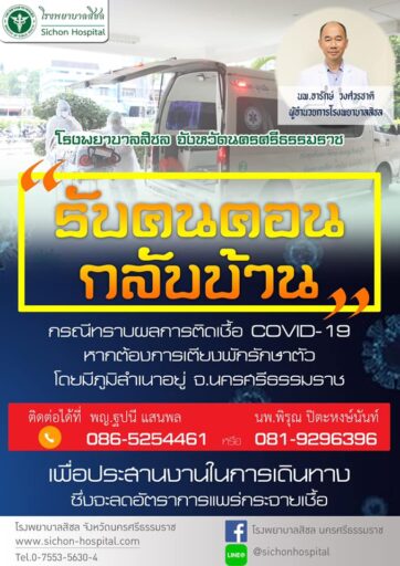 เมื่อวันที่ 4 ก.ค.2564 นพ.อารักษ์ วงศ์วรชาติ ผอ.รพ.สิชล จ.นครศรีธรรมราช เปิดเผยว่า ตามที่นายไกรศร วิศิษฎ์วงศ์ ผวจ.นครศรีธรรมราช ได้ประกาศให้ชาวนครศรีธรรมราชที่ติดเชื้อโควิด-19 จากพื้นที่สีแดงและต้องการกลับมารักษาตัวที่บ้านเกิดจาก จ.นครศรีธรรมราช ซึ่งได้เปิด 7 รพ.ไว้รองรับชาวนครศรีธรรมราชกลับบ้านเกิด ซึ่งล่าสุดเมื่อกลางดึกคืนที่ผ่านมาได้มีชาวนครศรีธรรมราชที่ป่วยติดเชื้อโควิดและแจ้งขอเข้ารับการรักษาที่ รพ.สิชลแล้วจำนวน 10ราย โดยผู้ป่วยทั้ง10คนได้เดินทางมาถึง รพ.สิชล แล้ว เมื่อเวลา 23.45น. 04.00 น. 05.30 น. โดยทุกคนเข้าที่พักหอผู้ป่วยโควิด-19 และทีมแพทย์ พยาบาล เภสัชกร นักรังสี เทคนิคการแพทย์ ร่วมประเมินอาการ เอกซเรย์ ตรวจเลือด ให้การรักษาเป็นที่เรียบร้อยแล้วทุกคน