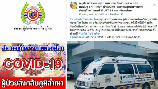 วันที่ 17 ก.ค. ผู้สื่อข่าวรายงานมาว่า จากกรณีที่จังหวัดพิษณุโลกมีประกาศรับผู้ป่วยติดเชื้อโควิด-19 กลุ่มสีเขียว ที่มีภูมิลำเนาอยู่ในจังหวัดพิษณุโลก และต้องการเดินทางเข้ามารับการรักษาที่บ้านเกิดนั้น แม้ว่าจังหวัดพิษณุโลกจะร่วมกับกองอำนวยการรักษาความมั่นคงภายในภาค 3 และกองทัพภาคที่ 3 จัดรถไปรับผู้ป่วยที่แจ้งความประสงค์จะขอเข้ารับการรักษาที่บ้านเกิดแล้วก็ตาม แต่ก็ยังมีผู้ป่วยติดเชื้อโควิด-19 จำนวนมากที่ติดต่อเข้ามาทางสมาคมกู้ภัยข่าวภาพ พิษณุโลก หลังได้ประกาศข้อความเผยแพร่ทางเพจสมาคมฯ ในเฟสบุ๊กว่า “แจ้งถึงประชาชนชาวจังหวัดพิษณุโลก ที่อยู่ตามต่างจังหวัด แล้วท่านตรวจโควิด ”ผลเป็นบวก” ต้องการกลับมารักษาตัวที่โรงพยาบาลในจังหวัดพิษณุโลก แต่ไม่มีรถกลับบ้าน โดยไม่สามารถเข้ารับการรักษาตัวในกรุงเทพและปริมณฑลได้ ทางสมาคมกู้ภัยข่าวภาพพิษณุโลก พร้อมที่จะจัดรถอำนวยความสะดวกไปรับและนำส่งโรงพยาบาลในจังหวัดพิษณุโลกให้กับท่าน แต่จะไม่มีการแวะบ้านหรือญาติพี่น้อง เพื่อหลีกเลี่ยงการติดโรค ทางเราจะประสานและพร้อมนำส่งโรงพยาบาลต่อให้ครับทันที_ที่ท่านร้องขอมา”