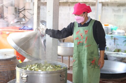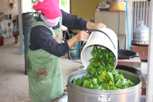 นางตะเพียน ท่าผา อายุ 55 ปี อยู่บ้านเลขที่ 103/1 ม.5 ต.พลายชุมพล อ.เมือง จ.พิษณุโลก ประธานกลุ่มขนมไทยแม่ตะเพียน กล่าวว่า ที่บ้านของตนเป็นแหล่งผลิตขนมไทยโบราณ ตามเทศกาล ส่งขายตามสถานที่ต่าง ๆ ในจังหวัดพิษณุโลก ทำมานานกว่า 20 ปีแล้ว มีลูกค้าขาประจำที่มารับและไปจำหน่ายทั่ว จ.พิษณุโลก แต่ปีนี้ยอดขายซบเซากว่าทุกปีที่ผ่านมา ปกติช่วงเทศกาลสารทจีน จะมียอดสั่งไม่ต่ำกว่า 2 พันกิโลกรัม จากลูกค้าในพื้นที่ อ.นครไทย อ.บางระกำ อ.วัดโบสถ์ แต่ปีนี้ในหลายพื้นที่ปิดหมู่บ้าน ไม่มียอดสั่งเข้ามาเลย ทำให้ยอดออเดอร์ช่วงเทศกาลสารทจีนในปีนี้หายไป 50% เหลือเพียง 1 พันกิโลกรัมเท่านั้น สำหรับปีนี้เริ่มลงมือทำขนมเทียน-ขนมเข่ง ตั้งแต่วันที่ 19 ส.ค.64 ที่ผ่านมา ใช้เวลา 3 วันก็น่าจะครบจำนวนตามที่สั่ง