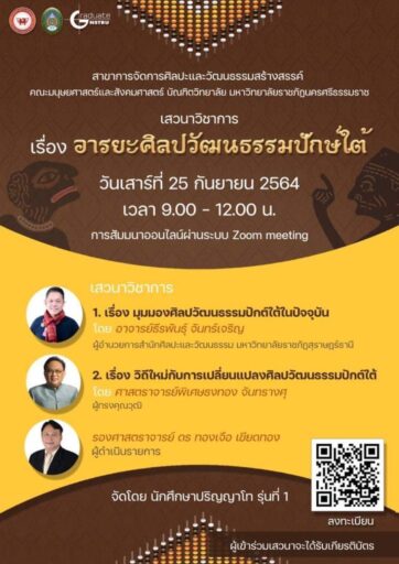 เมื่อวันที่ 22 กันยายน 2564 ผู้สื่อข่าวรายงานมาว่า นักศึกษาปริญญาโท รุ่นที่ 1 สาขาการจัดการศิลปะและวัฒนธรรมสร้างสรรค์ คณะมนุษยศาสตร์และสังคมศาสตร์ บัณฑิตวิทยาลัย มหาวิทยาลัยราชภัฎนครศรีธรรมราช ได้มีกำหนดจัดเสวนาวิชาการ เรื่อง อารยะศิลปวัฒนธรรมปักษ์ใต้ เพื่อพัฒนาการศึกษาให้เป็นหนึ่งของมหาวิทยาลัยราชภัฎนครศรีธรรมราช ในเวลา 09.00 – 12.00 น.วันเสาร์ที่ 25 กันยายน 2564 ซึ่งเป็นการสัมมนาออนไลน์ผ่านระบบ Zoom meeting ผู้ที่สนใจสามารถเข้าร่วมกิจกรรมดังกล่าวได้โดยสแกนคิวอาร์โค้ด และผู้จัดการเสวนาจะมีเกียรติบัตรมอบให้เป็นที่ระลึกในการเข้าร่วมกิจกรรม สำหรับหัวข้อในการเสวนาวิชาการมีดังนี้ 1.เรื่องมุมมองศิลปวัฒนธรรมปักษ์ใต้ในปัจจุบัน โดย อาจารย์ธีรพันธุ์ จันทร์เจริญ ผู้อำนวยการสำนักศิลปะและวัฒนธรรม มหาวิทยาลัยราชภัฎสุราษฏร์ธานี 2.เรื่องวิถีใหม่กับการเปลี่ยนแปลงศิลปวัฒนธรรมปักษ์ใต้ โดย ศาสตราจารย์พิเศษธงทอง จันทรางศุ ผู้ทรงคุณวุฒิ และ รองศาสตราจารย์ ดร.ทองเจือ เขียดทอง เป็นผู้ดำเนินรายการ กิจกรรมการเสวนาวิชาการในครั้งนี้