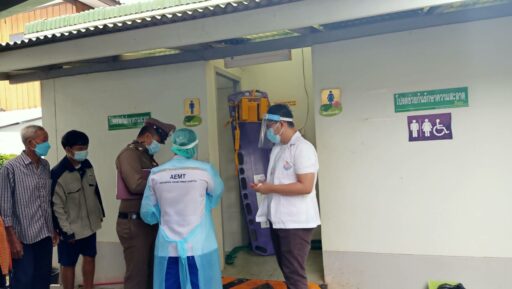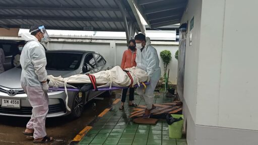 เจ้าหน้าที่สมาคมกู้ภัยนครไทยร่วมกับตำรวจและแพทย์ตรวจสอบ รปภ.เสียชีวิต โดยมีการป้องกันตามมาตรการของสาธารณสุขอย่างเคร่งครัด ก่อนนำร่างส่งชันสูตรที่โรงพยาบาล คาดหัวใจวายเฉียบพลัน ญาติเผยมีอาการวูบบ่อย