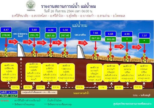 เมื่อเวลา 08.00 น. วันที่ 26 ก.ย.2564 นายชำนาญ ชูเที่ยง ผู้อำนวยการโครงการชลประทานพิษณุโลก เปิดเผยถึงสถานการณ์ แม่น้ำยม วันที่ 26 ก.ย. 64 เวลา 06.00 น. ว่า เนื่องด้วยปริมาณน้ำในแม่น้ำยมสายหลัก และแม่น้ำยมสายเก่ายังคงมีแนวโน้มน้ำปริมาณเพิ่มสูงขึ้นต่อเนื่อง จากฝนตกในพื้นที่ โดยมีสถานการณ์ ดังนี้ สถานีวัดน้ำ Y14.A อ.ศรีสัชนาลัย ปริมาณน้ำผ่าน 280.60 ลบ.ม./วินาที(มีแนวโน้มลดลง) และสถานี Y.4 อ.เมือง จ.สุโขทัย ปริมาณน้ำ 257.50 ลบ.ม./วินาที (มีแนวโน้มลดลง) ปตร.หาดสะพานจันทร์ มีปริมาณน้ำ 15.30 ล้าน ลบ.ม. คิดเป็น 100 เปอร์เซ็นต์