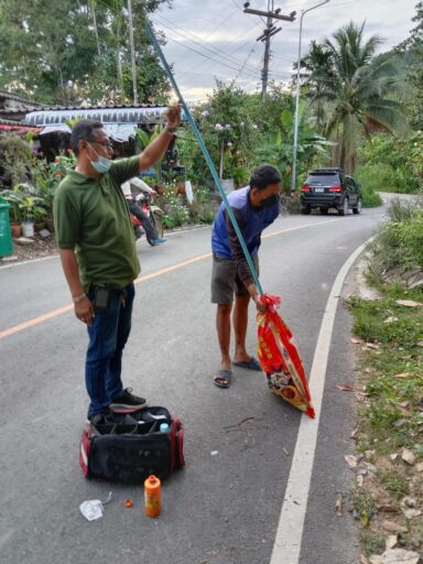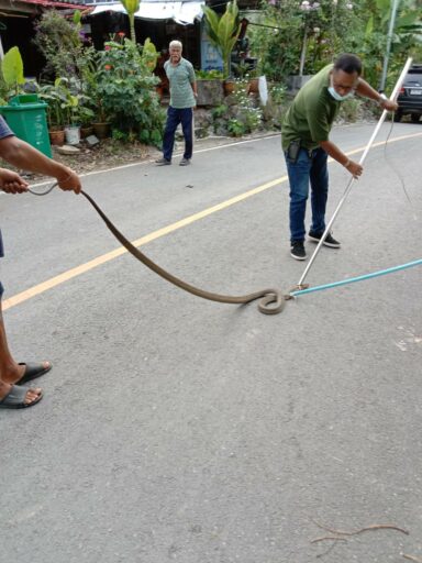 เมื่อเวลา 17.00 น.วันที่ 30 ต.ค.2564 นายลักษณันท์ ศรีจันทร์ เจ้าหน้าที่อาสาสมัครมูลนิธิประชาร่วมใจ เขตอำเภอนบพิตำ จ.นครศรีธรรมราช ได้รับแจ้งขอความช่วยเหลือไปจับงูจงอางเลื้อยเข้าไปในห้องน้ำบ้านเลขที่ 43/17 บ้านยอดเหลือง หมู่ 9 ต.นาเหรง อ.นบพิตำ จ.นครศรีธรรมราช รับแจ้งแล้วจึงพร้อมด้วยกำลังเจ้าหน้าที่อาสาสมัครมูลนิธิประชาร่วมใจ อำเภอนบพิตำ พร้อมอุปกรณ์ในการจับงู เดินทางไปช่วยเหลือจับงูในบ้านหลังดังกล่าว เมื่อเดินทางไปถึงพบนางบุญธรรม ทิพย์มณฑา อายุ 77 ปี เจ้าของบ้าน ได้พาเจ้าหน้าที่มูลนิธิประชาร่วมใจเข้าไปจับงูอางตัวขนาดใหญ่ยาวประมาณ 3 เมตร เลื้อยอยู่ในห้องน้ำ ซึ่งเจ้าหน้าที่ได้ใช้ไม้อุปกรณ์ในการจับงูทำการจับงูจงอางอย่างง่ายดายได้ภายในเวลาประมาณ 10 นาที