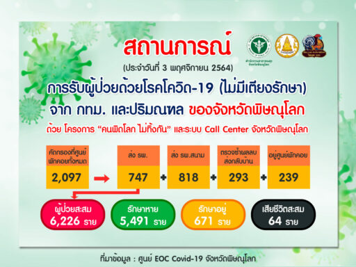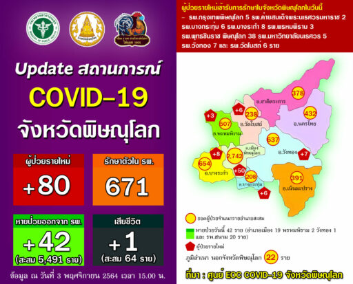 ส่วนสถานการณ์โรค Covid-19 จังหวัดพิษณุโลก ประจำวันที่ 3 พฤศจิกายน 2564 เวลา 15.00 น. มีผู้ป่วยรายใหม่ +80 ราย จำแนกเป็น อาศัยอยู่ในจังหวัดพิษณุโลก 80 ราย รวมผู้ป่วยรายใหม่ที่เข้ารับการรักษาในจังหวัดพิษณุโลกในวันนี้ ที่ รพ.กรุงเทพพิษณุโลก 5 รพ.ค่ายสมเด็จพระนเรศวรมหาราช 2 รพ.บางกระทุ่ม 6 ราย รพ.บางระกำ 8 ราย รพ.พรหมพิราม 3 ราย รพ.พุทธชินราช พิษณุโลก 38 ราย รพ.มหาวิทยาลัยนเรศวร 5 ราย รพ.วังทอง 7 ราย และ รพ.วัดโบสถ์ 6 ราย หายป่วยวันนี้ 42 ราย หายป่วยสะสม 5,491 ราย (อำเภอเมือง 19 ราย พรหมพิราม 2 ราย วังทอง 1 และ รพ.สนาม 20 ราย) ยังคงรักษาอยู่ 671 ราย เสียชีวิต รายใหม่ +1 ราย รวมเสียชีวิตสะสม 64 ราย