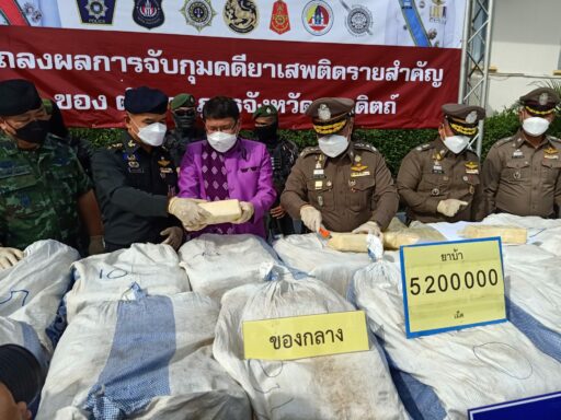 เมื่อเวลา 14.30 น. วันที่ 4 พฤศจิกายน ที่บริเวณลานจอดรถด้านหน้าสำนักงานตำรวจภูธรจังหวัดอุตรดิตถ์ พล.ต.ท.อัคราเดช พิมลศรี ผบช.ภ.6 พร้อมด้วย นายสหวิช อภิชัยวิศรุตกุล รอง ผวจ.อุตรดิตถ์ และ พล.ต.ต.สุทธิพงศ์ เป๊กทอง ผบก.ภ.จ.อุตรดิตถ์ นายสราวุธ ภักดี ผอ.สนง.ป้องกันและปราบปรามยาเสพติด ภาค 6 และ พ.ต.อ.โยธิน ยากองโค ผกก.สภ.ตรอน จ.อุตรดิตถ์ ร่วมกันแถลงข่าว การจับกุมผู้ต้องหาจำนวน 6 คน รถยนต์ 3 คัน โทรศัพท์มือถือ 7 เครื่อง และยาบ้าจำนวน 26 กระสอบ 2,600 มัดหรือ 5,200,000 เม็ด ซึ่งถือว่าเป็นยาบ้าล็อตใหญ่ที่สุดเท่าที่มีการจับกุมในพื้นที่ของ จ.อุตรดิตถ์ โดยเจ้าหน้าที่ตำรวจชุดป้องกันและปราบปรามยาเสพติด (ปส.) ภ.จว.อุตรดิตถ์ ร่วมกับเจ้าหน้าที่ตำรวจ ปส.สภ.ตรอน ตั้งจุดสกัดยาเสพติดและความมั่นคง ที่บริเวณด่านตรวจแยกน้ำอ่าง หมู่ 10 ต.น้ำอ่าง อ.ตรอน ถนนสาย 11 หรือ ถนนสายพิษณุโลก-อุตรดิตถ์-เด่นชัย จ.อุตรดิตถ์
