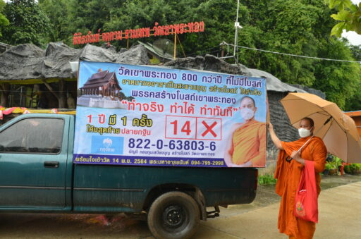 เมื่อเวลา 10.00 น. วันที่ 10 พ.ย.2564 ผู้สื่อข่าวรายงานบรรยากาศพื้นที่ อ.ชะอวด จ.นครศรีธรรมราช ช่วงการหาเสียงเลือกตั้งนายก ฯ สมาชิกสภาองค์การบริหารส่วนตำบล ว่าบรรดาผู้สมัครรับเลือกตั้ง แต่ละคน มีการงัดกลยุทธ์การขอคะแนนเสียง ทั้งการติดตั้งป้ายหาเสียง รถแห่ป้ายเสียง รวมทั้งเดินเท้าแบบเคาะประตูหน้าบ้านเรือนของประชาชน เพื่อขอคะแนนเสียง อย่างไรก็ตามมีรถแห่ป้ายหาเสียงคันหนึ่ง ที่มีลักษณะแปลกตาจากรถหาเสียงของนักการเมืองทั่วไป ซึ่งเป็นรถแห่ป้ายประชาสัมพันธ์ที่ติดตั้งป้ายไวนิล พร้อมระบุข้อความ “วัดเขาพระทอง 800 กว่าปีที่ไม่มีโบสถ์ อาตมาขออาสาเป็นสะพานบุญ สร้างโบสถ์ให้เสร็จ พรรคสร้างโบสถ์เขาพระทอง “ทำจริง ทำได้ ทำทันที“ 1 ปี มี 1 ครั้ง โค้งสุดท้ายปลายกฐิน 14 X พร้อมใจเข้าวัด 14 พ.ย.2564 บัญชีกองทุนเสบียงบุญ สร้างโบสถ์ วัดเขาพระทอง 822 – 0 – 63803 – 6 พระมหาอารยนันต์ 094-795-2998 ” พร้อมกับเปิดเครื่องเสียงประชาสัมพันธ์เชิญชวนญาติโยมเข้าวัดร่วมทอดกฐินสามัคคี เพื่อสร้างโบสถ์ ขับเคลื่อนไปตามถนนภายในหมู่บ้าน ซึ่งได้รับความสนใจจากชาวบ้านในพื้นที่อย่างมาก เนื่องจากไม่เคยเห็นรถแห่ประชาสัมพันธ์ลักษณะแบบนี้มาก่อน รวมทั้งยังยังเข้ากับสถานการณ์ปัจจุบันที่อยู่ในช่วงการหาเสียงเลือกตั้งองค์การบริหารส่วนตำบลในพื้นที่