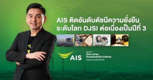 AIS ติดอันดับดัชนีความยั่งยืนระดับโลก DJSI ต่อเนื่องเป็นปีที่ 3 ตอกย้ำภารกิจเพื่อความยั่งยืน ในฐานะผู้นำอุตสาหกรรมโทรคมนาคมไทย เดินหน้าขับเคลื่อนประเทศด้วยเศรษฐกิจดิจิทัลให้เกิดการพัฒนาและเติบโตอย่างยั่งยืน