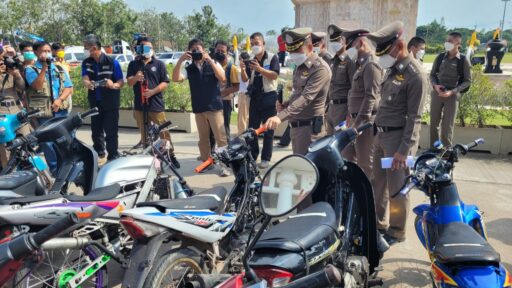 ตำรวจภูธรภาค 6 แถลงผลการจับกุมแก๊งแข่งรถในทาง รวมทั้งทริปน้ำไม่อาบ 1,300 คัน และความผิดอื่นที่เกี่ยวข้องตรวจยึดรถจักรยานยนต์ 616 คันตรวจยึดท่อไอเสียที่มีการดัดแปลงสภาพจำนวน 206 ชิ้น