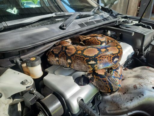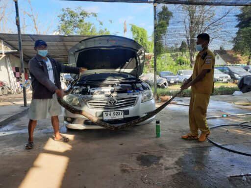 งูเหลือมซุกในรถยนต์พนักงานเปิดฝากระโปรงเจอเผ่นกระเจิง