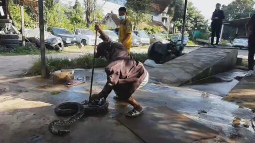 แต่งูเกิดอาการตกใจเลื้อยเข้าไปอยู่ในจุดที่ลึกลงไปใต้เครื่องยนต์ เจ้าหน้าที่กู้ภัยและพนักงานของร้านต้องค้นหากระทั่งเจอหางของงูอยู่บริเวณซุ้มล้อรถด้านซ้ายของตัวรถ จึงช่วยกันจับหางงูดึงออกมาอย่างทุลักทุเล กระทั่งสามารถดึงงูหลุดออกมาจากตัวรถได้ เมื่องูออกมาจากตัวรถยังชูคอจะฉกเจ้าหน้าที่กู้ภัยและพนักงานของร้านที่ช่วยกันดึงออกมาอยู่หลายครั้ง สร้างความตื่นตระหนกให้กับพนักงานที่อยู่ในเหตุการณ์เป็นอย่างมาก กระทั่งเจ้าหน้าที่กู้ภัยใช้อุปกรณ์จับงูได้ในที่สุด ก่อนนำใส่กระสอบเพื่อนำไปปล่อยคืนสู่ธรรมชาติในที่ห่างไกลชุมชนต่อไป