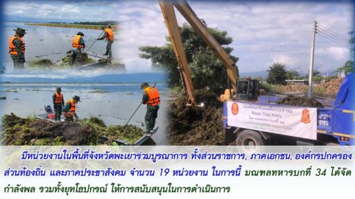 ในการนี้ มณฑลทหารบกที่ 34 ได้จัดกำลังพล รวมทั้งยุทโธปกรณ์ ให้การสนับสนุนในการดำเนินการ ดังนี้ รถโกยตักสายพาน (Backhoe) จำนวน 1 คัน พร้อมพลขับ 1 นาย การปฏิบัติ : ขุดลอก, ตักขนย้ายผักตบชวา และจอกแหน หรือตามที่จังหวัดพะเยาประสานการปฏิบัติ รถบรรทุกแบบเทท้ายขนาดใหญ่ จำนวน 2 คัน พร้อมพลขับ 2 นาย การปฏิบัติ : ขนย้ายผักตบชวา และจอกแหน ไปกองรวมตามจุดต่างๆ ที่กำหนดไว้ หรือตามที่จังหวัดพะเยาประสานการปฏิบัติ รถบรรทุกแบบเทท้าย 6 ล้อ ได้ขนย้ายผักตบ และชวาจอกแหน ไปยังตำบลทิ้ง ณ ค่ายขุนเจืองธรรมิกราช จำนวน 122 เที่ยว เพื่อทำเป็นปุ๋ยหมัก ใช้ในการเกษตร โดยจะนำไปใช้กับโครงการ “ทหารพันธุ์ดี” ต่อไป เรือท้องแบนพร้อมเครื่องยนต์ จำนวน 2 ลำ พร้อมพลขับและกำลังพล จำนวน 7 นาย ร่วมกันเก็บกวาด, ผลัก, ดัน, ขนย้ายผักตบชวา และจอกแหน ช่วยประคองทุ่น ในการลากจูงผักตบชวา และจอกแหน และตรวจสำรวจทุ่นที่เสียหาย และลาดตระเวนดูพื้นที่ ที่เกี่ยวข้องเมื่อได้รับการประสาน