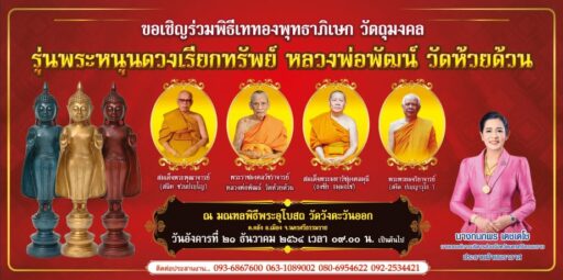 “หลวงพ่อพัฒน์” เกจิดังอายุ 100 ปีจากวัดห้วยด้วน เมืองปากน้ำโพนครสวรรค์นั่งเครื่องบินเป็นครั้งแรกในชีวิตเหยียบถิ่นเมืองนครศรีธรรมราช-สักการะพระบรมธาตุเจดีย์, เททองและปลุกเสก “พระหนุนดวง” วัดวังตะวันออก อ.เมือง จ.นครศรีธรรมราช วันที่ 21 ธ.ค.นี้-ทางวัดเตรียมวัตถุมงคลพระหนุนดวง หัวนะโม และตาพรานบุญเข้าร่วมในพิธีปลุกเสกครั้งประวัติศาสตร์