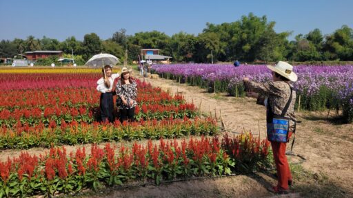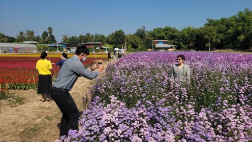 นักท่องเที่ยวแห่เที่ยวชมทุ่งดอกมากาเร็ต ดอกซีโลเซีย บานสะพรั่งหลากสีสัน รับลมหนาว อย่างสวยงาม พร้อมชิมเมล่อนออแกนิค หวานกรอบ ฝีมือ 2 ข้าราชการสามี ที่มีใจรักในการทำไร่นาสวนผสมบนพื้นที่กว่า 13 ไร่